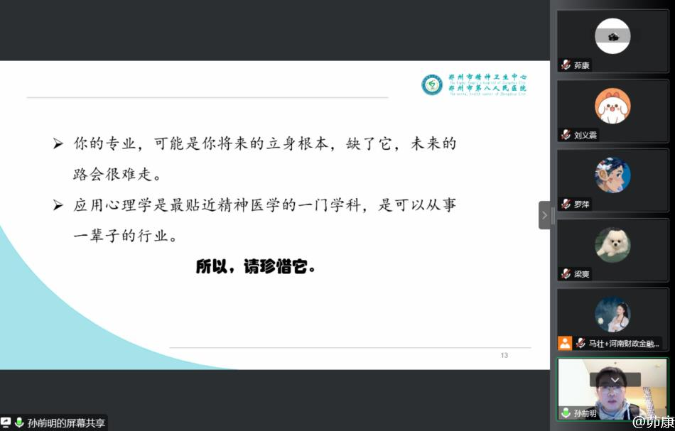 本次讲座是在线上举办,主要内容是疫情下心理学在精神疾病中的应用、常见精神心理问题的举例以及关于心理学发展前景的介绍。首先,马壮副经理发起了会议,由心理学教研室主任夏令老师主持并向大家介绍了主讲人孙前明医师的基本情况。
