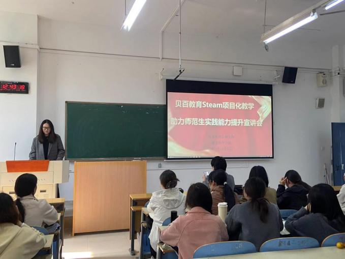 2024年10月22日,伟德bv1946官网联合师范类专业实践教学能力提升项目团队,携手公司产教融合基地——郑州贝百教育科技有限公司,在文津楼208教室成功举办了“STEAM项目化教学助力学前教育专业实践教学能力提升宣讲会”。