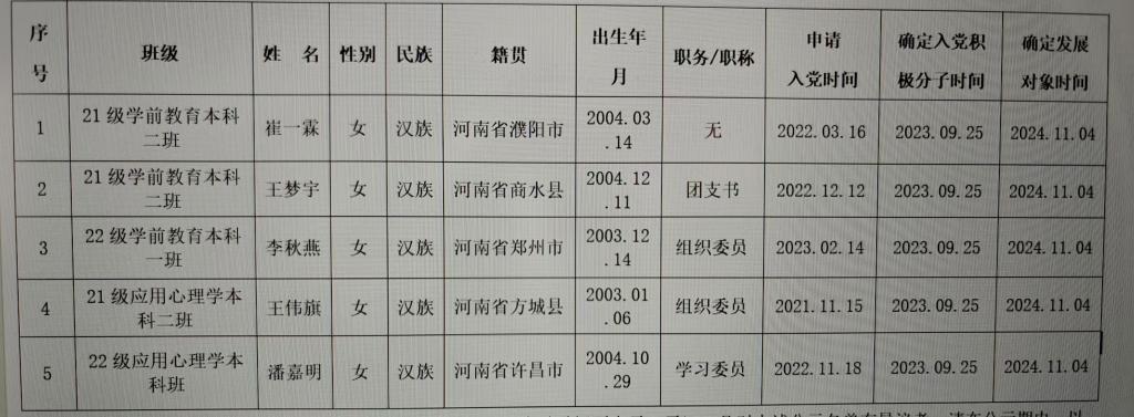 综合培养考察、党校培训和政治审查情况,经支委会审查和党总支审议,拟于近期召开支部大会接收崔一霖等5名同志为中共预备党员。现将有关情况公示如下: