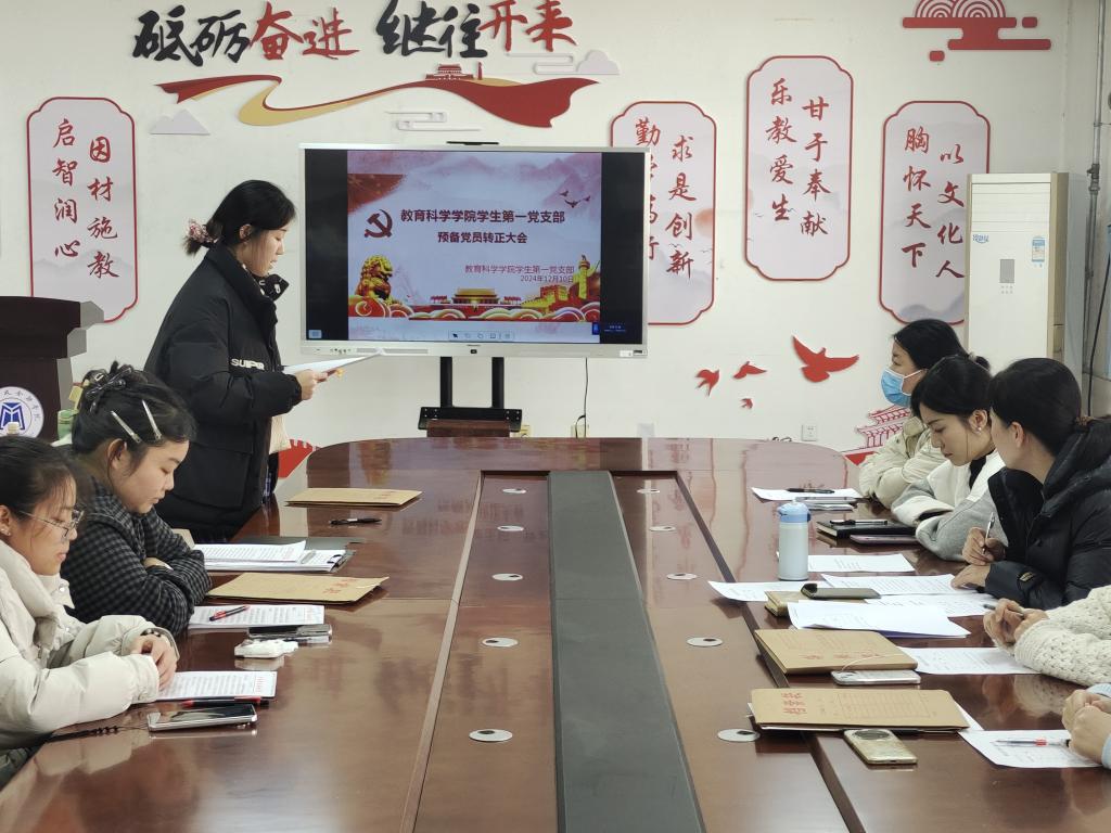 2024年12月10日,教育科学公司员工第一党支部于知行楼727召开支部大会,讨论通过2024年秋期接收预备党员和转正党员。参会的有员工第一党支部书记杨晶晶、员工第一党支部组织委员唐楠、辅导员胡怡铭以及员工第一党支部全体党员、预备党员同志。
