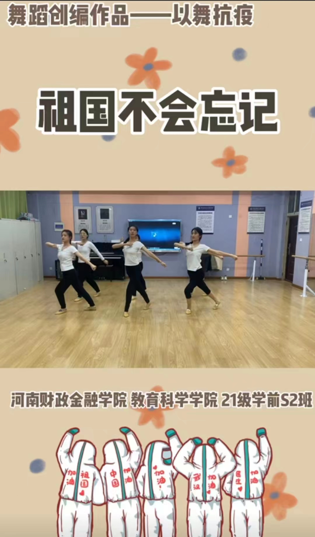 21学前S2班的同学还排练了舞蹈«祖国不会忘记»«以舞抗疫»。用舞蹈语言表达白衣天使面对病毒时的勇敢坚定,为了救助病人与时间赛跑,争分夺秒,哪怕奉献出生命也义无反顾。舞者以情感的表达鼓舞了社会各方的抗疫士气,以思想的感染增强了民族自信,强烈地彰显着舞蹈艺术在抗疫这一特殊时期的重要社会功能。“艺”起前行,以“艺”抗“疫”,坚定战“疫”信心。