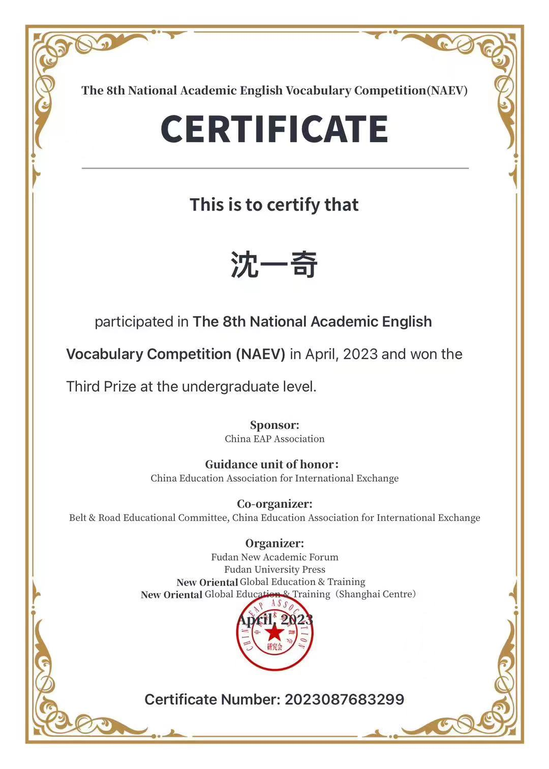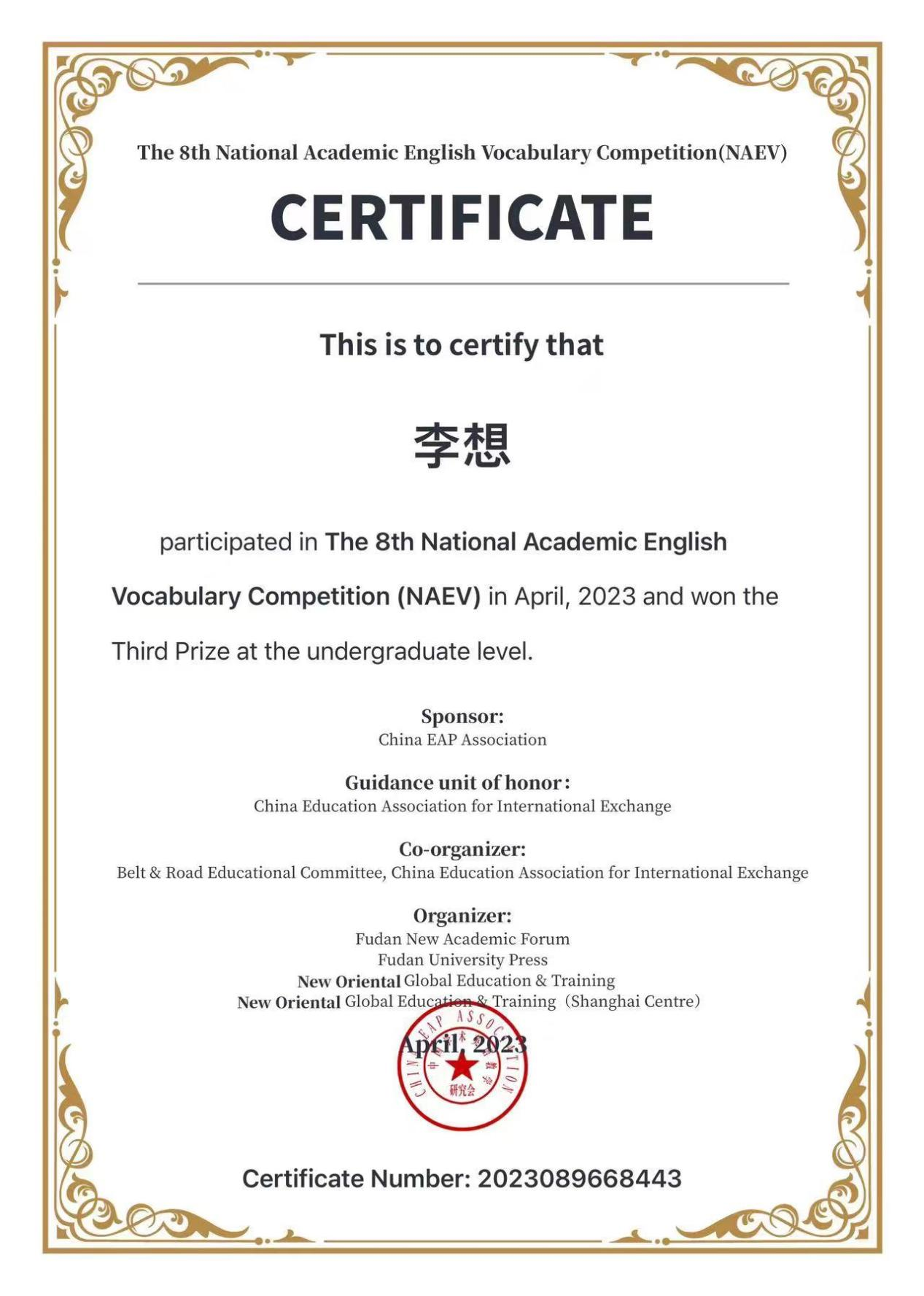 在第八届全国老员工学术英语词汇竞赛(The 8th National Academic English Vocabulary Competition)省级复赛中,2021级学前教育本科一班李苏洁、沈一奇以及2022级学前教育本科三班李想荣获省级三等奖。