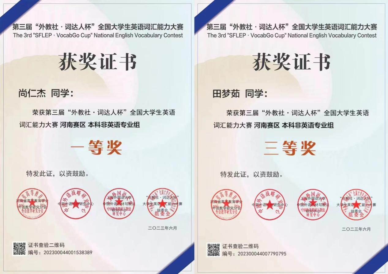 在第三届“外教社·词达人杯”全国老员工英语词汇能力大赛省级复赛中,2020级应用心理学本科一班尚仁杰、田梦茹荣获省级三等奖。