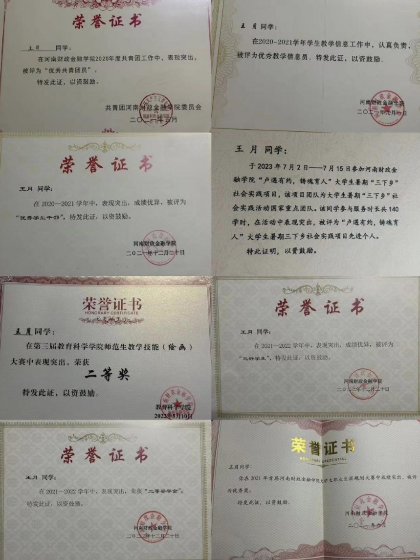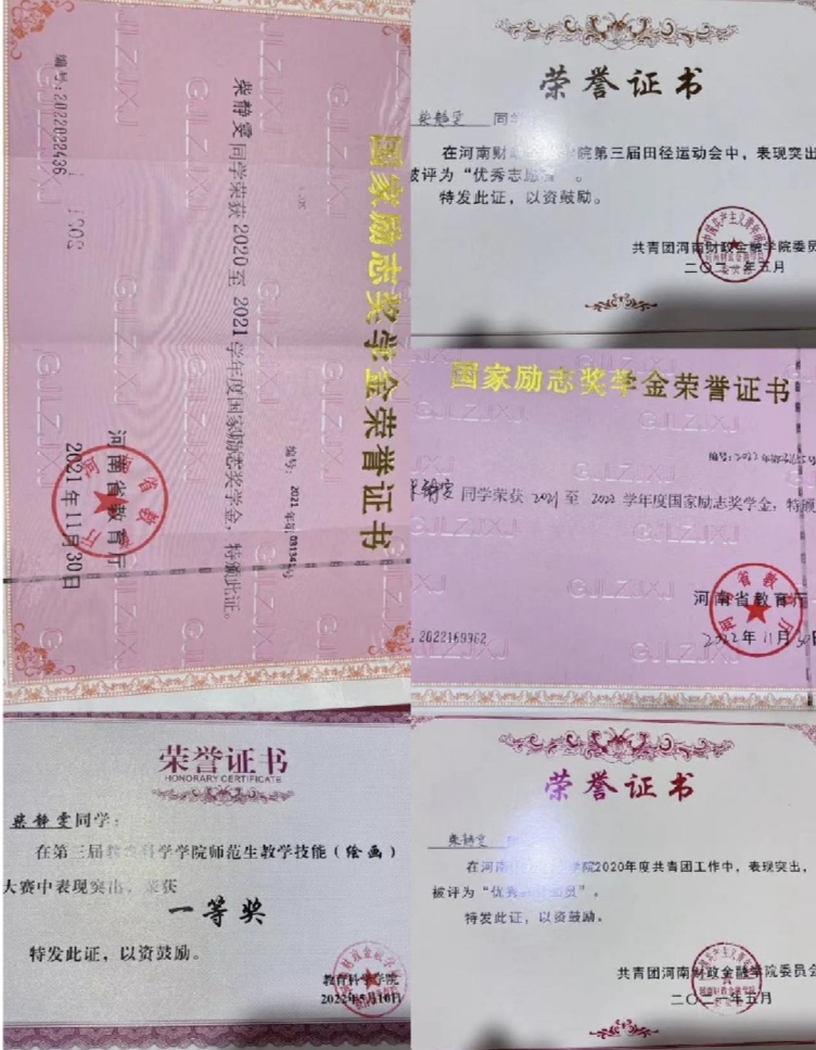 该生生活勤俭节约,不与人攀比,勤工俭学,利用课余时间在校内外做各种兼职,不仅减少了家庭的负担,还增加了社会经验。始终怀着积极向上的心态去面对生活中的难题,从不退缩;同时还积极参加志愿服务活动,走出课堂、走出校园。在校疫情防控期间,主动参与疫情防控值班工作和核酸志愿者活动;在2023年7月加入伟德bv1946官网“卢遇有约,铸魂育人”暑期社会实践服务团到三门峡卢氏进行为期两周的支教活动,培养了该生较强的实践工作能力和较高的社会责任感。