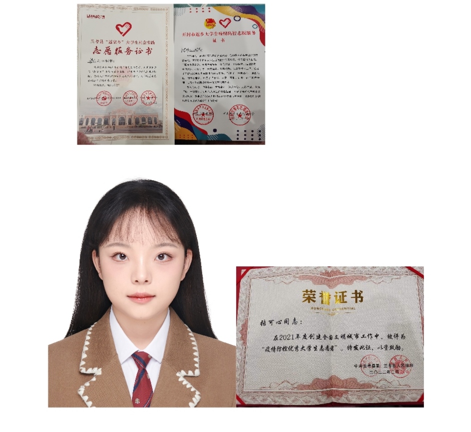 思想提高,回报社会。她热爱祖国、热爱人民、热爱劳动,被选拔为入党积极分子,经常主动加强政治理论学习,努力提高思想觉悟和政治素质,坚持四项根本原则,拥护改革开放,热爱社会主义祖国,拥护中国共产党的领导,认真学习马克思列宁主义、毛泽东思想、邓小平理论及"三个代表"的重要思想,正确贯彻执行党的路线、方针、政策和上级的决定,能处理好个人与国家、集体的关系。她认真参加团支部组织的每次学习与讨论 ,积极主动参加各种志愿活动,努力做到全心全意为人民服务,自觉遵守国家法律、法规和校规校纪,是社会主义的好公民。在疫情期间她多次参加疫情防控志愿服务活动,并荣获中共应举镇委员会应举镇人民政府授予的“优秀志愿者”称号,还曾在2022年抗击新冠疫情防控工作中被封丘县应举镇西大村村民委员会评为“优秀志愿者”,曾在公司运动会中担任志愿者,被共青团伟德bv1946官网委员会评为“优秀志愿者”。