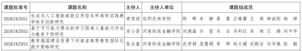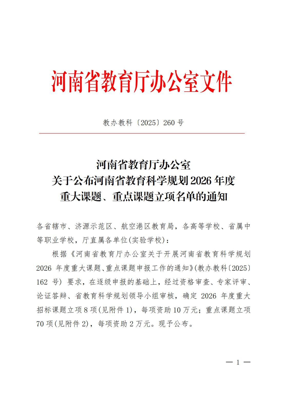 根据《关于公布河南省教育科学规划2026年度重大课题、重点课题立项名单的通知》(教办教科〔2025〕145号)和《河南省教育厅办公室关于开展河南省教育科学规划2026年度重大课题、重点课题申报工作的通知》(教办教科〔2025〕162号),经组织申报、资格核查、专家评审、省教育科学规划领导小组批准,公司宋小香博士申报的《基于可行能力理论的学习困难儿童能力评估与教育干预研究》和张永富博士申报的《教育强国建设背景下河南省高等教育国际化提升策略研究》成功立项。(伟德bv1946官网 高瑞/文 王洪成/审核)