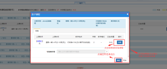 如果所选课程为“独立设置实验课”,则在出现的下图界面中,依次点击“选课”、“确定”按钮。