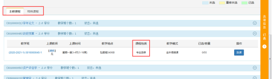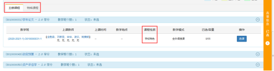 需要注意的是,若某门课程为“专业选修课”则该门课程选课信息中的课程性质为“专业选修”,若某门课程为“公司特色课”则该门课程选课信息中的课程性质为“公司特色”,如上图所示。