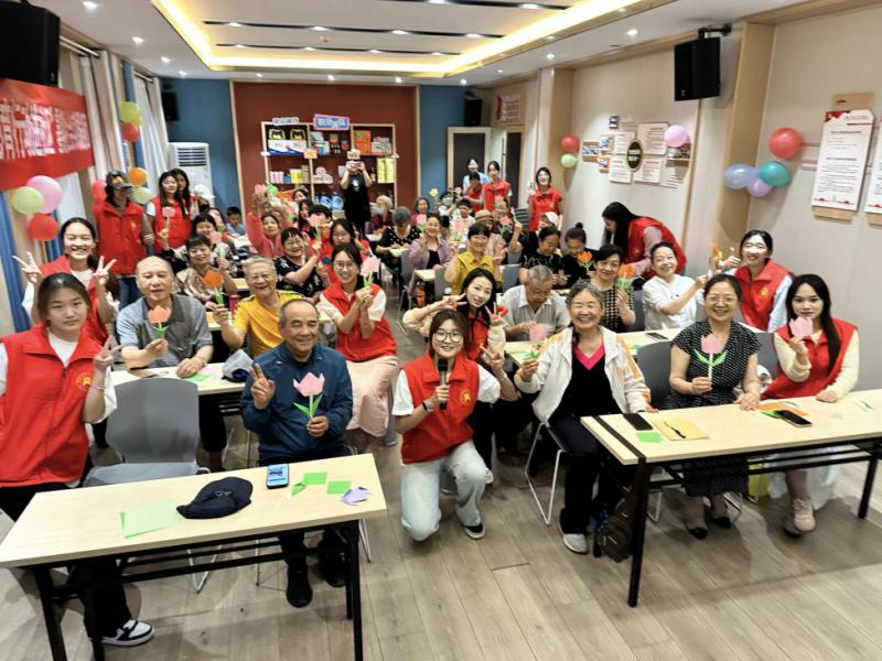 在备受期待的折纸环节里,志愿者们准备了五色彩纸,从对折、翻转到最后的整形,每个环节都耐心讲解,志愿者们一步步引导老人制作郁金香。随着一朵朵纸花的绽放,老人们脸上也洋溢起自豪的笑容。活动最后,老人们手持自制的郁金香,与志愿者们拍下洋溢着幸福的大合照,定格这温馨时刻。